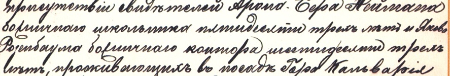 …присутствии свидетелей Арона-Бера Неймана борничного(?) школьника*) пятидесяти трех лет и Якова Розенбаума