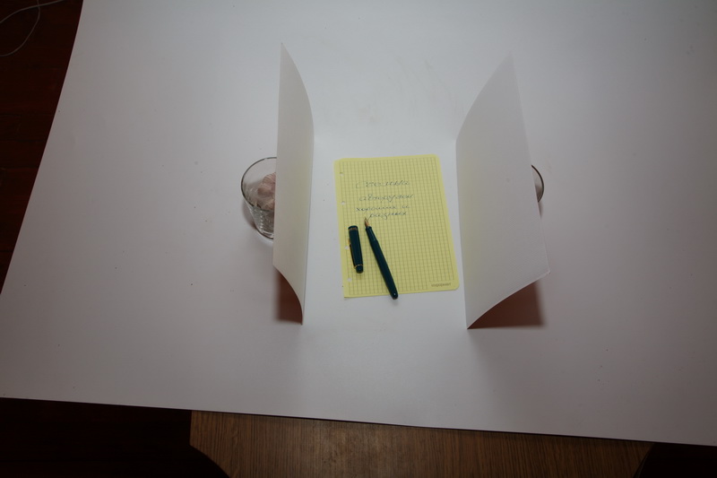 главная проблема в фотографировании авторучек и текста на большинстве форумов не то чем снимают а то как светят. понятно что большинство снимают фотоаппаратами со встроенной вспышкой. это приводит к тому что центр кадра светом выбивается напрочь а края темные. или передний план светлый а задний темный. помочь могут рассеиватели и отражатели. рассеивателем может служить марля или кусок бинта. его помещают перед вспышкой, количество слоев может служить увеличению или уменшению рассеивания. а отражателями могут служить листы картона
