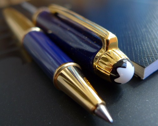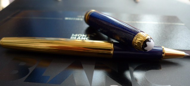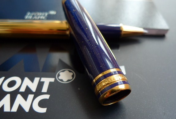 "Tribute to a dynasty of Pharaohs: Meisterstuck Ramses II. Made of lapis lazuli, a gemstone by the rulers of ancient Egypt. The Meisterstuck Ramses II roller ball is covered with Blue genuine Lapis Lazuli stone with gold dust and vermeil barrel. Montblanc factory has stopped the production on the Blue Lapis Lazuli stone because of the difficulty to find the stone. It is also getting very expensive to produce it anymore."