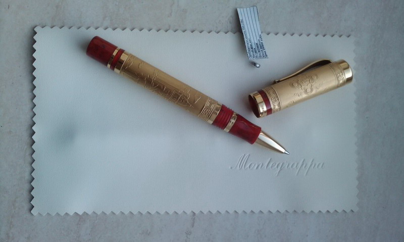 Роллер-ручка, корпус – золото 750. Колпачок ручки украшают фрагменты фресок и напольной мозаики, найденных в домах зажиточных горожан Помпеи. Орнаменты, изображенные на корпусе ручки с помощью низкорельефной гравировки, выполнены по мотивам знаменитого цикла фресок на стенах величественной Villa dei Misteri, датированного I веком до н. э. Красная акриловая смола с особым оттенком, повторяет их знаменитый цвет.Изображение триумфальной арки Септимиуса Северуса (203 г.н.э.) расположенной на северо-восточной стороне римского Форума и Храм Сатурна, воздвигнутый в V веке до н. э. украшают корпус ручки. Изящная шкатулка из клена украшена металлической пластиной, на которой выгравировано изображение важнейших символов Рима. Съемный (отворачиваемый) колпачок