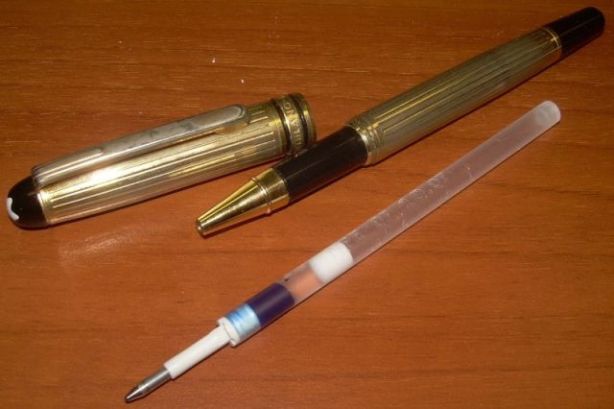 Без коробки и документов - досталась мне по наследству от предыдущего сотрудника на старом рабочем месте, с потёртостями жёлтого покрытия (позолота это или нет –не знаю, судебно-химическую экспертизу не проводил…) на клипсе и одной стороне корпуса колпачка от ношения во внутреннем кармане пиджака - потому и цена смехотворная для Монблана. Размер потёртостей видно на фотографиях. Вполне годится как имиджевый пишущий инструмент для тех, кто привык считать свои деньги, но хочет пользоваться красивыми вещами. Я её «кормил» стандартными гелевыми стержнями BIC – вполне подходят по размеру. Продаю за ненадобностью.