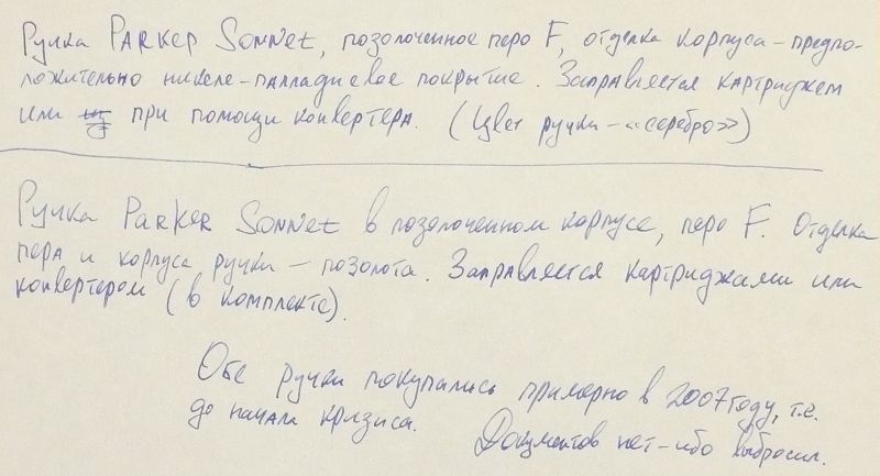 Parker Sonnet , производства Франции, (позолота) в хорошем состоянии, использовалась по назначению, потом 3 года как не использую. В футляре, но без документов. Перо размера F позолоченное, в идеальном состоянии (перо), пишет легко и свободно. Отделка корпуса – позолота. На левой стороне колпачка и корпуса ручки имеются потёртости позолоты – носил её во внутреннем кармане костюма без футляра – потому и обтёр один бок.