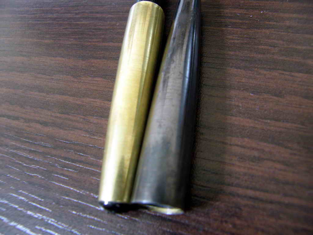 Купил гель для воронения (которым оружие защитным слоем покрывают). Корпус ручки отполировал, заодно обезжирил. Дальше по-инструкции: нанести слой геля, через 5 минут смыть, повторить 5-6 раз. Результат не очень. Что-то пятнами стало проступать. Решил просто оставить часть корпуса в геле на полчаса. Через полчаса посмотрел и ахнул. Черным-черно! Матово-черное покрытие. На радостях промыл, и погрузил в гель полностью верхнюю часть ручки (отдельно от остальной). Потом все промыл. Вроде получилось очень неплохо. Оставалось колпачек заворонить. Но радость была преждевременная. Когда после промывки все подсохло, слой воронения местами выкрошился, местами откалывался при малейшем нажатии. Самое неприятное, последующее воронение делало защитный слой все хуже и хуже. Т.е. по всей видимости, бронзу и латунь воронить смысла нет. Пришлось опять шлифовать нулевкой, снимая слой воронения и потом полировать до блеска. Цапон лак не держится. Какие еще варианты? Автолак?
