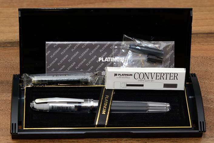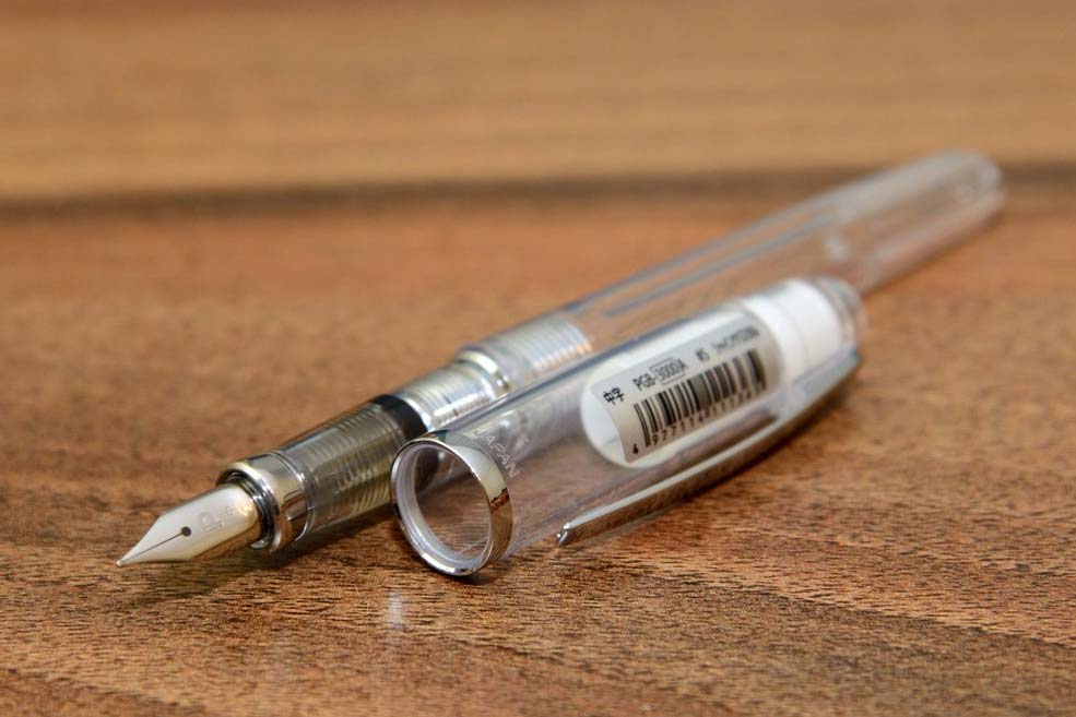 Перьевая ручка в прозрачном корпусе.