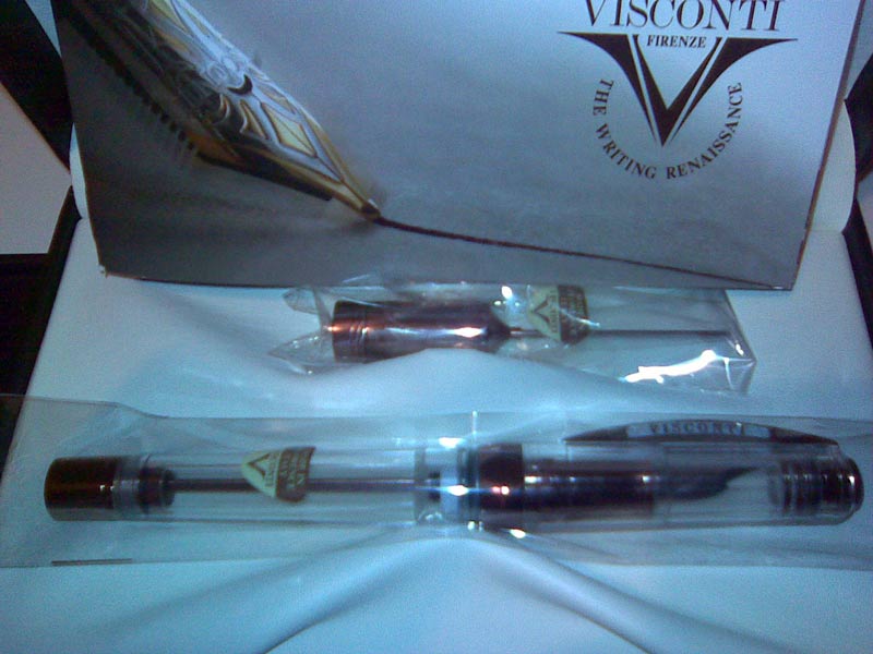 Если быть точным, то там написано: Visconti Opera Crystal Clear Demonstrator limited edition fountain pen with a broad point SmarTouch Tubular nib and Mosquito ink filling adapter by Visconti.