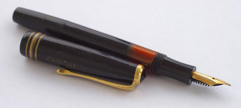 Перьевая ручка с поршневой системой заправки и окошком для контроля уровня чернил. Золотое перо 14к. На пере логотип в виде головы льва. При нажиме перо пишет как Stub с шириной линии примерно 0.7 - 0.8 мм. а без нажима что-то вроде Medium, но с весьма заметной разницей между вертикальным и горизонтальным штрихом. Относительно года выпуска и фирмы производителя (на колпачке написанно UNIverSAL) ничего сказать не могу, но функционально все исправно: поршень набирает чернила, резба колпачка в хорошем состоянии.