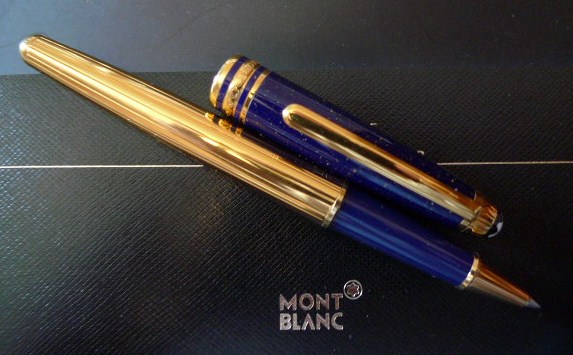"Tribute to a dynasty of Pharaohs: Meisterstuck Ramses II. Made of lapis lazuli, a gemstone by the rulers of ancient Egypt. The Meisterstuck Ramses II roller ball is covered with Blue genuine Lapis Lazuli stone with gold dust and vermeil barrel. Montblanc factory has stopped the production on the Blue Lapis Lazuli stone because of the difficulty to find the stone. It is also getting very expensive to produce it anymore."