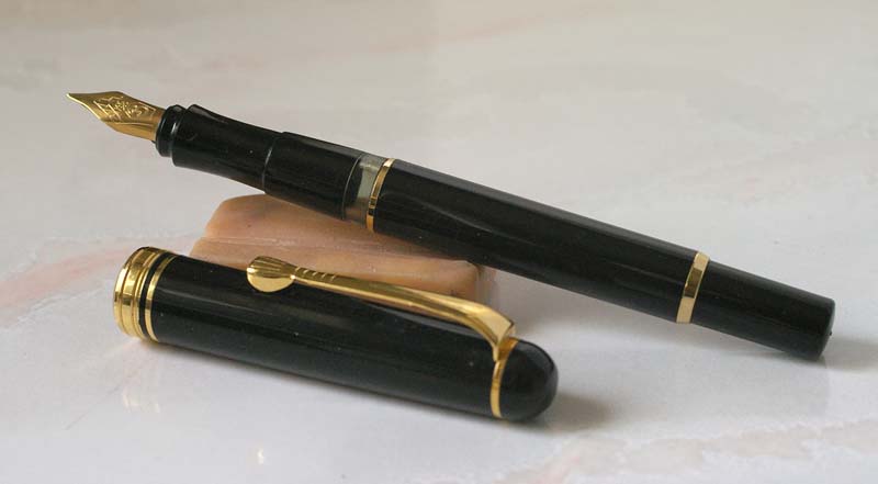 Вобщем несколько загадочная ручка. Ну а если не вникать в ее происхождение, то это вполне рабочая ручка. Поршень ходит мягко и набирает довольно приличное количество чернил. Есть окошко для контроля их уровня. Подача чернил довольно обильная. Перо Fine – Medium. Если писать на хорошо проклеенной бумаге, то почти Fine, на обычной же (принтерной) бумаге, чернила начинают немного расплываться и линия становиться ближе к Medium. Колпачок на защелке. Легко снимается и одевается. Внешнее состояние очень хорошее. Никаких потертостей и царапин нет.