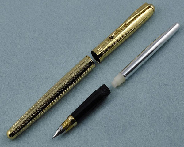 Классическая женская ручка, но мужчинам она тоже нравится. Корпус - золотистый металл с инкрустацией. Вес 20г. Длина с колпачком 13.2см, без колпчка - 12,5, толшина 10мм. Таких есть 3шт. Пишет красиво, я такой пользуюсь каждый день, практически не выпуская из рук.