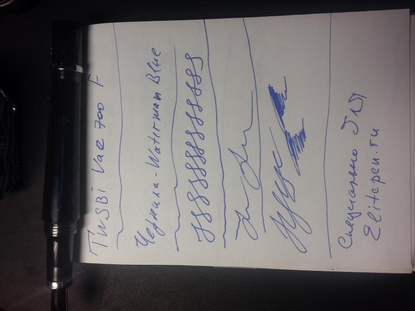 Но в целом ручка понравилась - тяжелая, но не сильно, в руке лежит удобно. Пишет мягко, без пропусков. Линия ровная. Подача чернил не обильная - на не очень качественной бумаге линия не растекается даже с такими текучими чернилами, как Waterman - как раз ими и заправил, чтобы подачу проверить. Позже заправлю Private Reserv-ом, посмотрю как ручка себя поведет.