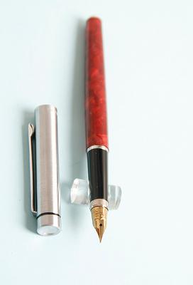 Классическая ручка из целлулоида с металлическим колпачком. Перо — открытое, сталь с иридиевым наконечником, F. Заправка - пипетка.