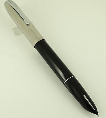 Очень редкая ручка с закрытым пером F, корпус пластик, колпачек — металл, заправка — пипетка.