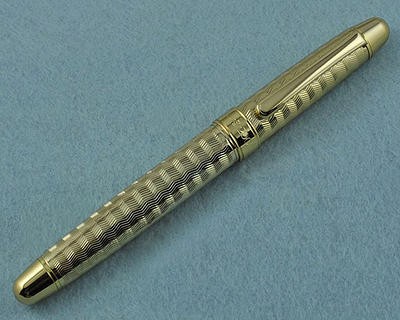 Тяжелая сигарообразная ручка для настоящих мужчин в металлическом корпусе с резным орнаментом. Выглядит на миллион. Перо открытое F–M, ближе к европейскому F из стали с иридиевым наконечником. Заправка пипеткой.