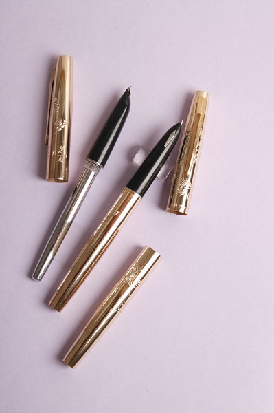 Перьевая ручка 70-80х годов с популярным в то время резным орнаментом в виде орла (феникса). Золотистый цвет, закрытое перо F, пипетка. Длина в колпачке - 13,8см, длина - 12,6см, толщина - 1,1см. Ручка очень похожа на Golden Star 703, но без стрелки рядом с пером.