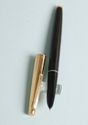 Классическая ручка из целлулоида с металлическим колпачком. Перо — открытое, сталь с иридиевым наконечником, F. Заправка - пипетка.