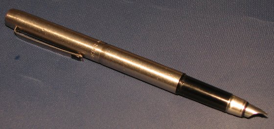 На фотографиях -- Parker предположительно 1970-х годов выпуска. Корпус, скорее всего, нержавеющая сталь без покрытия, перо также нержавеющая сталь, вероятно, без наплавок. На колпачке "овальный" логотип и надпись "PARKER made in England II". На пере, фидере и грипе никаких надписей не обнаружено. Оригинальная система заправки: "паркеровская" сменная пипетка, к моменту появления ручки у меня в руках была уже повреждена (порвана). Я некоторое время пользовался ручкой с чернильными картриджами. Ручка, несмотря на металлический корпус, довольно легкая, но в моих руках иногда царапает бумагу, вероятно из-за того, что ранее использовалась другим владельцем.