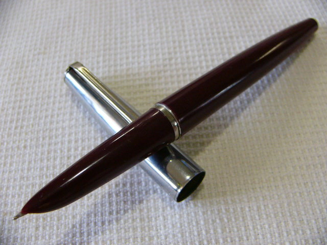 Корпус авторучки: бордовый с блестящим колпачком белого металла.