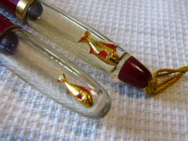 Корпус: бордовый с жёлтым колпачком с рисунком и резервуаром с золотой рыбкой без жидкости.