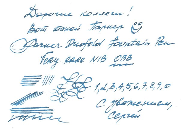 А на некоторых чернилах, таких как Вотерман Вайолет, вообще льёт как не знаю что. На чёрных пеликановских отлично, сейчас зарядил Диамайн Империал Блю, тоже неплохо. Поэтому сильно сомневался, что смогу без дискомфорта этим ОВВ написать хоть страницу, потому как почерк у меня не очень крупный.