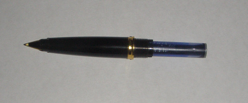 В воскресенье на работе от скуки попытался вставить картридж Sheaffer в Parker 45 (показалось, что у 45-го приемное отверстие под картридж достаточно широкое). Встал. Несколько плотновато. Вот так:
