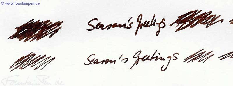 Чернила Season's Greeting 2006 года имеют очень приятный коричный запах и весьма, конечно, нейтральный, ненавязчивый цвет. Не могу сказать, что они "туго" пишут. Наоборот, они мне жидкими показались. Применяла их сначала в Вотермане Гармоние, а потом в Паркере Фронтьер. В Паркере они мне нравятся больше. У Паркера толще перо.