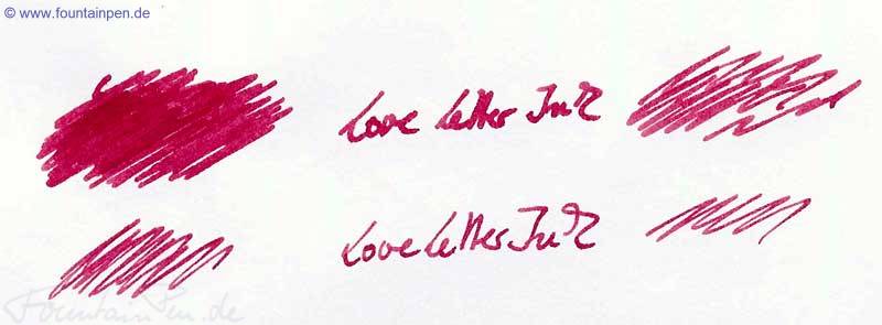 Запах практически не выражен, при использовании Fine пера дает темный, насыщенный, но полупрозрачный след на бумаге. Субъективно, после пеликановских чернил, перо идет как бы "туже", с большим трением скольжения по бумаге, но вполне можно делать беглые записи.