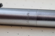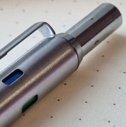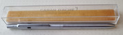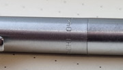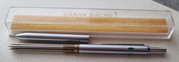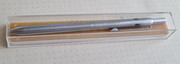 Caran D'Ache, made in Switzerland, 80-е годы. Корпус из сатинированной хромированной латуни. На колпачке импринт: Caran d'Ache 0414. Механизм кнопочный, гравитационный (символ выбранного цвета должен находится наверху, прежде чем нажать на кнопку). Стержни формата D1 длина 6,7 см., синего, красного, зелёного и чёрного цветов. Ручка в очень хорошем состоянии, механизм полностью рабочий. Есть незначительная потеря хрома на кнопке. Стержни установлены новые (кроме зелёного, вместо него ещё один синий). В комплекте коробка.