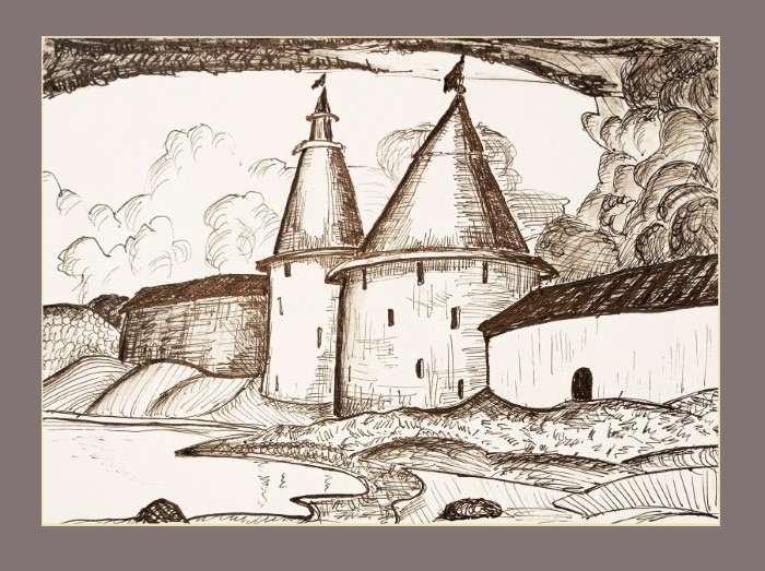 «За́мковые сторожевые башни и грозовое небо» скетч, перо