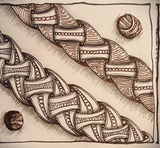 «Two Twisted Stripes» зентангл, 2026, перо, чёрн+коричн.чернила, угольный карандаш, растушевка.