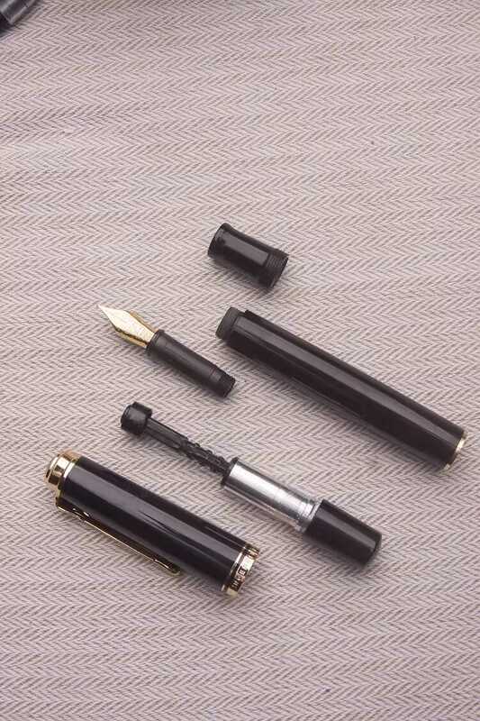 Если верить подписи в заказе, мне достались J400. Оказались хорошие ручки с поршнем, и, в частности, перьевой блок Schmidt F #5 (несовместимый с Pelikan M200/M205) легко выкручивается и ставится обратно.
