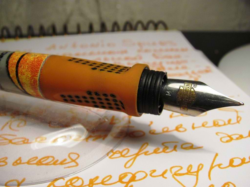 Сама ручка довольна проста,внешне схожа с серией BIC X "Софья"- отличие лишь в цветовом оформлении.Отличительной чертой данной серии является эргономическая конфигурация грипа,выполненной,образно говоря,в форме скруглённого треугольника.Я имею ввиду так называемые срезы на грипе под большой,указательный и средний пальцы.Ручка очень хорошо лежит в руке,лёгкая.Изготовлена из пластика,а грип для удобства покрыт тонким слоем мягкой резины оранжевого цвета,напоминая расцветку баскетбольного мяча.Под пальцы на срезе грипа удачно вставлено крапление из черного пластика в виде пупырышек,приятных на ощупь.На прозрачном колпачке логотип "BIC".Перо стальное со штампом фирменного "человечка" и римской цифрой 1(наверное для обозначения ширины линии пера).Пишет перо достаточно мягко и обильно,но для меня широковато.Поэтому поставил перо с фидером от почившей ручки Stypen "Harley-Davidson",благо они идентичны по размеру.Пользуюсь этой ручкой уже 6 лет в качестве резервной в экстримальных ситуациях.Смело могу рекомендовать её школьникам,студентам и в качестве "летнего" пера.Стоимость - 6.5$.