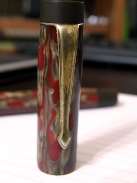 | alexbalt писал(а): | Та, что бардовая с желтыми разводами имеет миниатюрное по сравнению с габаритами ручки золотое Bold перо "Warranted 14ct 1st quality". Больше никаких опознавательных знаков на ней нет. Шла "в довесок" к другой. Эбонитовые закрутки на колпачке и на кнопе заборника коричневые, то бишь очень старенькие. Клип похож на коневеевский (характерный ромб на кончике). Еще я эту ручку зову "головная боль", потому что когда ее отмывал, она начинала гнуться как разогретый пластик. Она и без воды, видимо за счет неравномерного нагрева с разных сторон, "кочевряжится" (становится слегка кривой). Целлулоидная.