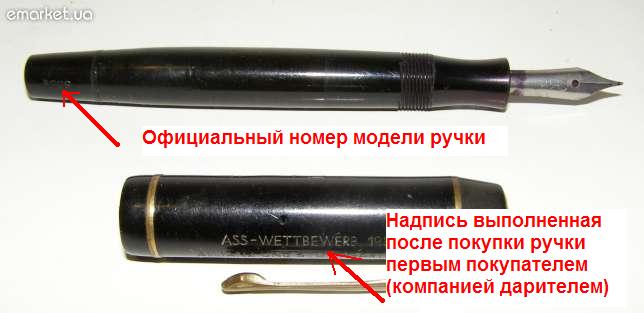 Детальнее смотреть именно на номер и это будет ответом о модели ручки. На ручке реклама немецкого Банка (др. финансовой организации) страхования жизни в 1938г. По всей видимости эта гравировка была выполненна первым покупателем, т.е руководство банка могло купить в магазине эту ручку, заказать выполнение на корпусе своей гравировки и дальше или эта ручка была подарена одному из своих сотрудников за успешную работу или одному из уважаемых клиентов банка. О банке немного здесь: