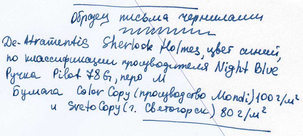 На этот раз заправил в Pilot 78G (nib M) чернила Sherlock Holmes, цвет Night Blue. На письме цвет темный серо-голубой (возможно есть какие-то аналоги, о которых я не знаю).