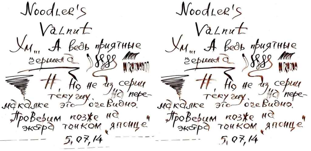 Ну вот и коричневый Нудлерс в собрание подъехал,. Протестировал Valnut... Хороши чернила,слов нет. По характеристикам подкрадываются к Iroshizuku ( я о тёмно-коричневых), очень близки к английскому Chocolate Brown, но у "америкоса" на тонком пере заметно лучше смазываемость, чем у "англичанина". Чуток насыщенности добавил на правом фото,чтобы был виден реальный цвет. Одно огорчило - влагу они не любят, под дождём ими не попишешь И ещё. Первый раз открываю флакон с чернилами, залитые "по самые гланды". Скажу проще ( а то вдруг не так меня новички поймут) - открутил крышку, а чернил там - по самое горлышко,даже нет ни одного мл для продыха. Вот ведь интересно, столько в собрании флаконов практически всех мировых производителей,но только у этого пиндоса такое. Причём на разных цветах. Вопрос знатокам - собственно зачем сие? Мне эти лишние грамульки и на фиг не сдались, а вот перепачкаться из-за этого можно более,чем конкретно ( а ежели нарваться на несмыаемые - вообще караул!).