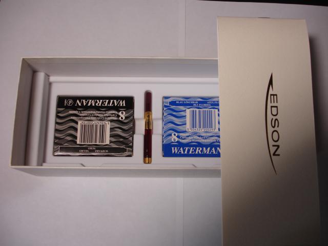 Ручка посвящённая основателю компании Waterman.Edson 18 каратное перо из чистого золота и полупрозрачный корпус глубокого тёмно- бордового цвета из лимитированной серии,номерная,перо F.Ручка абсолюдно новая,не использовалась. Комплект:транзитная упаковка,коробка,фирм коробка Edson,паспорт качества,конвертор в цвет корпуса,2 уп картриджей (черн + синий) Цена:35.000,Место нахождения -Mосква. тел:89164987670