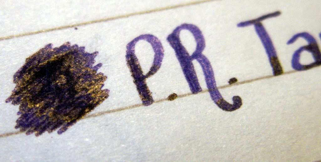 | Современная фиолетовая Радуга оставляет золотистый отлив, но к сожалению не на бумаге, а на фидере и на черном грипе, заправляемых ей ручек. Немного золотистости оставляет Diamine "Imperial Purple", но не на каждой бумаге.