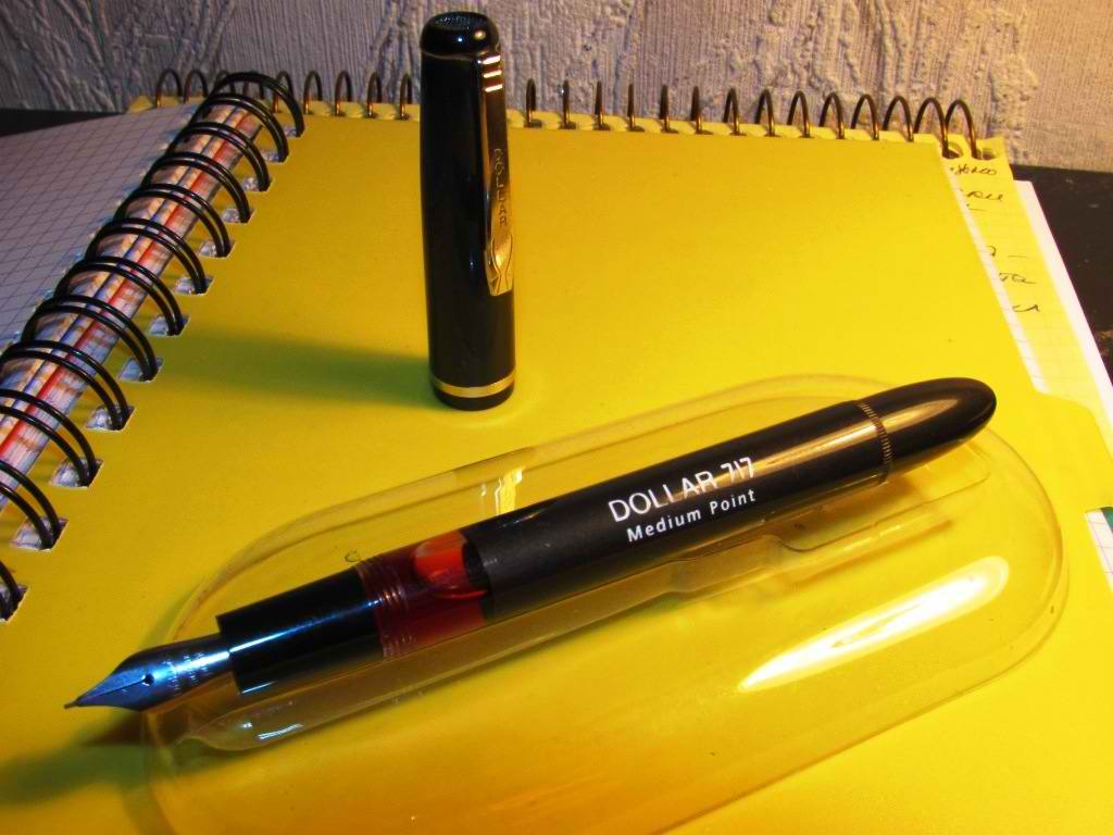 | Распробовал наконец демонстраторы Dollar 717i . И внешний вид и качество письма мне очень понравилось с учетом цены. Правда я по умолчанию сразу же слегка подшлифовал кончик пера. Но все-таки когда однажды исписал этой ручкой примерно полную страницу в "один присест", то столкнулся с упоминаемым и некоторыми другими владельцами этой модели "глюком". Ручка попросту отказалась дальше писать из-за прекращения подачи чернил. После небольшого перерыва она записала вновь как ни в чем не бывало. Видимо это связано с конструктивной особенностью поршня и вязкостью чернил. У меня были заправлены Diamine Syrah.