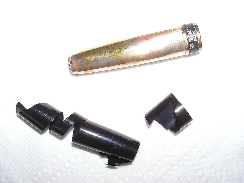 Вчера вечером решил помыть старенький Вотерман Эксперт, который я на днях забрал у товарища, у которого ручка уже несколько лет болталась на письменном столе в стакане. Разобрал ручку и начал промывать под проточной водой. Были обнаружены 4 цвета чернил, некогда использовавшиеся в этой ручке, причём в разных частях ручки ))). Мыл долго. Когда вода выходила уже слабо окрашеной чернилами решил перейти к нашатырю. Взял грамм двадцать 10-ти процентного раствора нашатыря, грамм сто воды, разобрал ручку и положил все части в этот раствор. Через часок заглянул в ёмкость - на дне собрался слой с чернилами. Достал части ручки из раствора и начал промывать в проточной воде. И оп-па! Лак с колпачка слез.