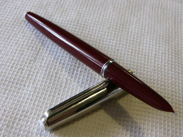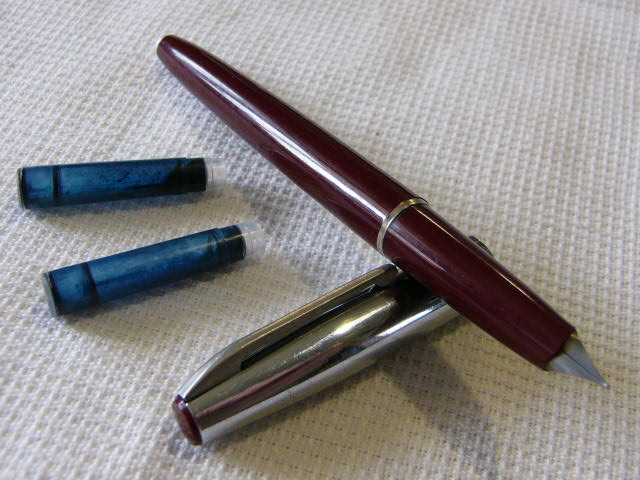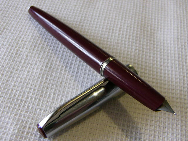 Корпус авторучки: бордовый с блестящим колпачком белого металла.