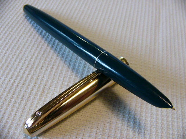 Авторучка "Два в одном": на одном конце перьевая авторучка с открытым пером, на другом конце шариковая авторучка.