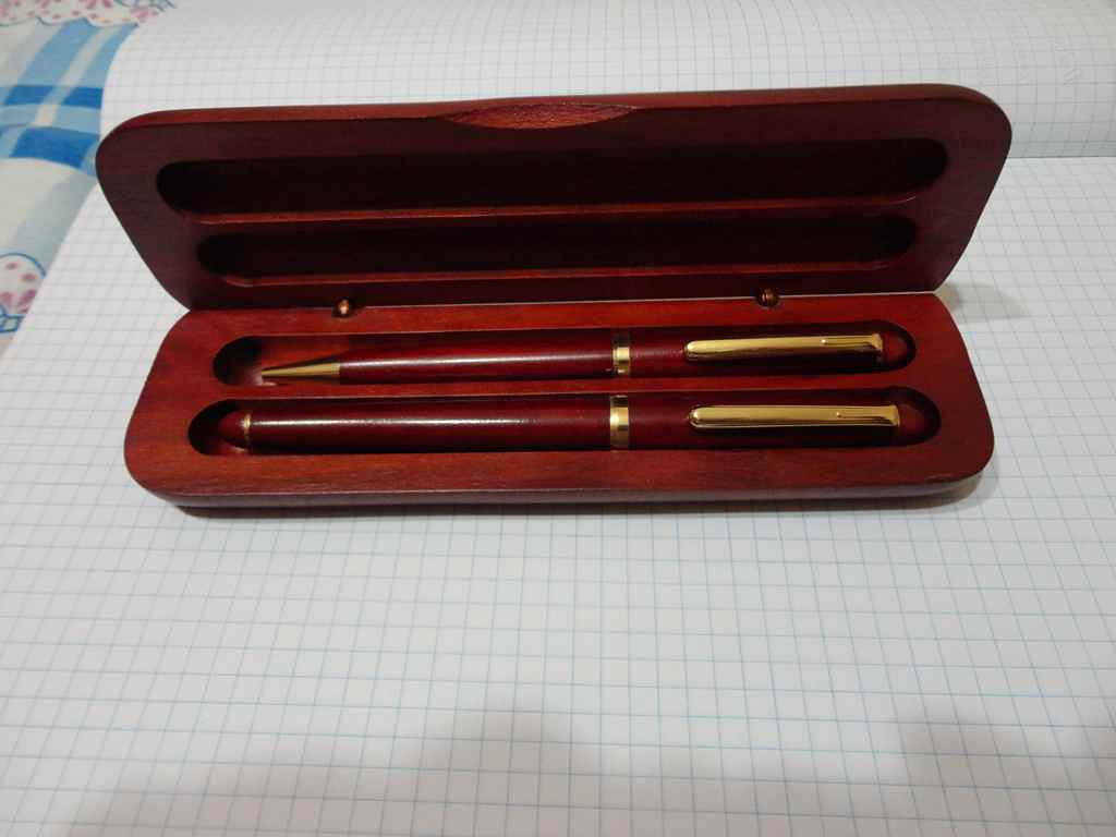 Дальше у нас - наборчик, якобы немецкий. Нонейм. Шариковая и перьевая ручка "в дереве". Как ручки - середнячки, но перо весьма нестандартное. Не знаю как объяснить, фотки плохо получаются. В общем, такое впечатление, что перо держа горизонтально зажали кончиком в тиски, от чего концы крыльев развернулись вертикально. Там где у нормальных перьев шарик, у этого - два плотно прилегающих вертикальных кружочка на концах. При письме очень странное ощущение получается, вверх-вниз перо идет нормально, а вправо-влево сильно шуршит по бумаге. Так наверное и получилось выражение "скрипит перо"... Тем не менее - пишет хорошо, недостаток - слабая резьба, пластик к тому же плоховато нарезанная...