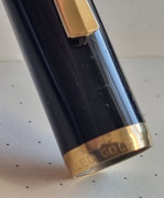 Корпус из смолы чёрного цвета, между баррелем и грип-секцией прозрачная. синяя вставка для контроля уровня чернил. В комплекте колпачок от аналогичной ручки (Pelikan M25/MK30). Колпачок на трении. В навершии колпачка камень с Пеликаном и 2-я птенцами, по краю колпачка импринт: Pelikan Rolled Gold + Germany +. "Родной" колпачок с трещинкой, также в комплекте.