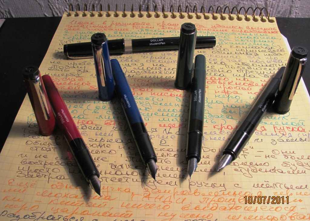 Купил в Кишинёве DOLLAR Student,взял сразу пригоршню из 5 штук разных цветов.Цена удивила,на российские 20 рублей за экземпляр получается.Каждую заправил чернилами под цвет ручки.И ведь пишут.Все пять,одна правда чуть царапает,но это поправимо.У Дмитрия на сайте 717-ая модель хорошо описана с фото (спасибо Вам, запомнил название).Завтра сфотографирую.Малобюджетная ручка для школьников,студентов и просто начинающих с тонким пером и нормальной подачей чернил.