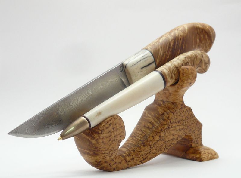К ручкам пришел долгой дорогой. Через ножи. Была первая попытка сделать настольный прибор для любителя финок. Нож для разрезания бумаги - обычная финка с дамассковым клинком и ручка, тоже в форме финки, из рога лося и карелки. Носик выточил из латуни, а внутрь просто вставил пастик обыкновенный. Тогда и понял, что нужно искать качественную фурнитуру. Нашел. Результаты смотрите. Жду оценок, критики, советов. А то от друзей-ножеделов не дождешься...