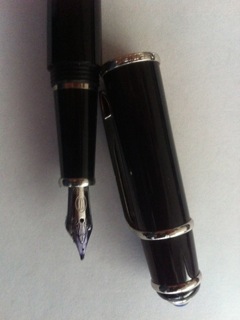 Перьевая ручка, корпус и колпачок из черного композитного материала, палладиевая отделка деталей, кабошон из каучука цвета синего сапфира , покрытого родием, перо из золота 18 карат, была в комплекте коробка с черными чернилами.