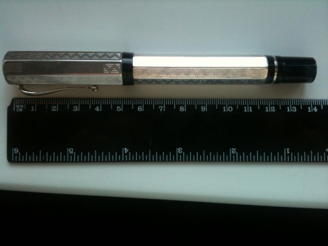 Перо - золото, 18К. Корпус, колпачок - стерлинговое серебро 925. На корпусе нанесен оригинальный орнамент. Система заправки - чернилами с помощью конвертера. Ручка имеет восьмигранную форму.