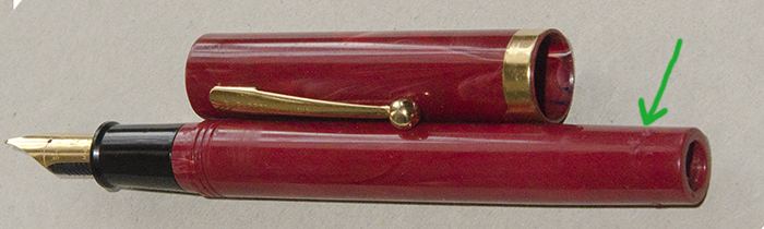 Sheaffer NoNonsense М. На ручке малозаметные потертости от закручивающегося колпачка и небольшой дефект на барреле (показан стрелкой)