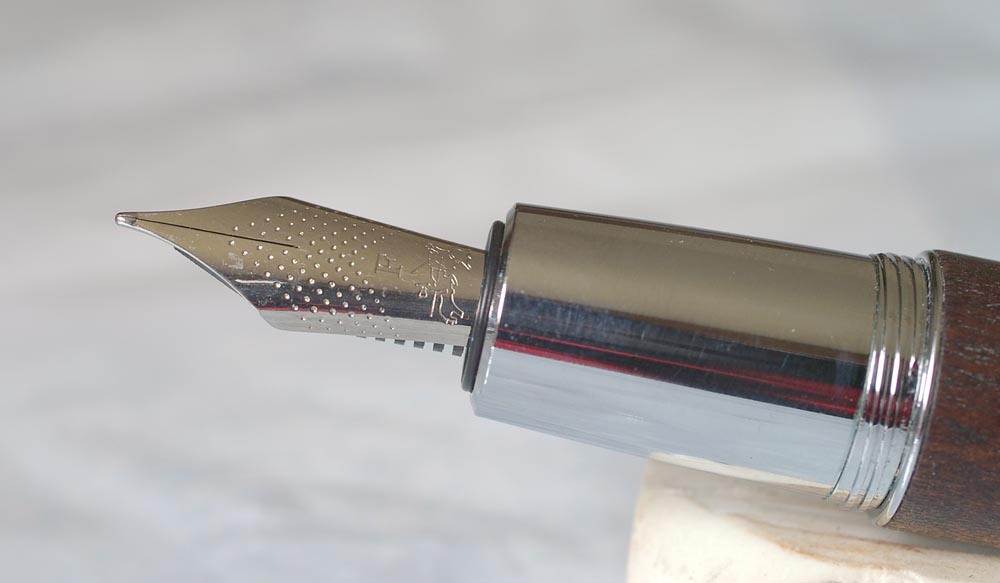 Хромированный и довольно массивный колпачок на резьбе (короткой). Барель из дерева. Cистема заправки - картридж/конвертер.