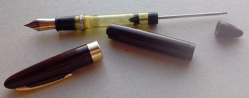 "Your pen is a 1948 injection-molded Vac-Fil with an internal cartridge. That model was only made for about a year (it was the last Vac-Fil Sheaffer built, they went to the Touchdown in 1949). The feed is made to fit that particular pen and nib. It is friction-fit and does not have an inner collar like the earlier ones did..."